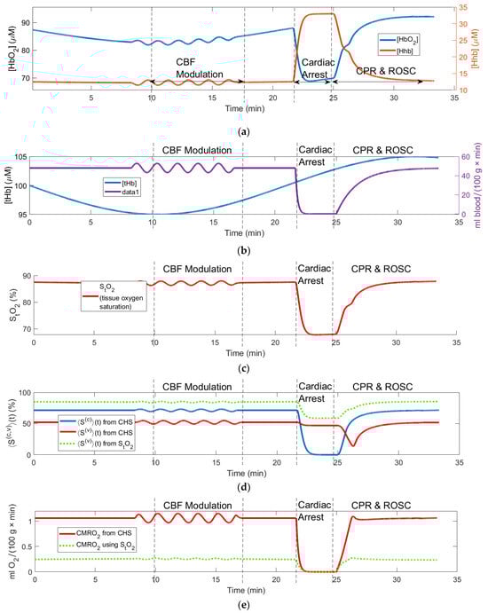 Changes in the simulated and computed CHS model variables. (a): computed [HbO2] and [HHb] responses to simulated [tHb] and CBF changes (b); (c): computed changes in StO2 (tissue oxygen saturation); (d) computed responses in ⟨⟩(t) and ⟨⟩(t); (e) computed CMRO2 responses. Vertical lines show the time limits of the simulated epochs of the CBF periodic modulation, cardiac arrest, CPR, and ROSC.