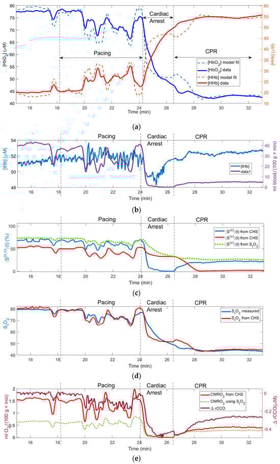Physiological variables measured and computed during a cardiac arrest experiment on a pig: (a) measured and fitted traces of [HbO2] and [HHb], R2 = 0.96; (b) measured [tHb] and computed CBF; (c) computed capillary ⟨⟩(t) and venule oxygen saturations ⟨⟩(t); (d) measured and computed StO2; (e) computed changes in CMRO2 and measured ΔrCCO changes.