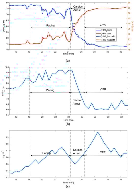 Variables and parameters during a cardiac arrest experiment on a pig obtained using sweeping 30 s interval fitting: (a) measured and fitted traces of [HbO2] and [HHb], R2 = 0.99; (b) recovered changes in arterial oxygen saturation (t); (c) recovered changes in oxygen diffusion rate .