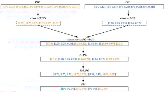 Algorithm 2 is used for fine sensor mapping based on coarse sensor mapping. First, the significance degree of each sensor is calculated, as shown in lines 3–4. Then, the significance degrees are clustered, and the clusters are ranked by the value of their centroids, as shown in line 5. Note that for ∀1 ≤ i ≤ |{PG*#1, PG*#2, …}|, the centroid of PG*#i is greater than centroid of PG*#i+1. Next, the maximal subset of successive alternate clusters is identified, where the sensors of two adjacent clusters come from different smart homes, as shown in lines 7–18. Then, fine pg value mappings are determined by iteratively searching for the most similar clusters from the maximal subset of successive alternate clusters, as shown in lines 19–27. Finally, the function getSensorsMapping is used to generate the fine sensor mappings corresponding to the fine pg value mappings. Figure 2 illustrates Algorithm 2. PG* and PG# represent two sets of sensor significance degrees generated from two different smart homes, respectively. For example, in PG*, the pair (s*1, 0.35) indicates that the significance degree of sensor s*1 is 0.35. Using these significance degrees, sensors are clustered within both PG* and PG#. For instance, (s*2, 0.26) and (s*5, 0.22) belong to the same cluster. After clustering, all clusters in PG* and PG# are ranked by their centroid values. Clusters are then segmented if two consecutive clusters are from either PG* or PG#, resulting in the creation of A_PG. For example, the sequence {0.35}, {0.28, 0.25, 0.21}, {0.26, 0.22}, {0.14, 0.12}, and {0.09, 0.07} forms an element of A_PG. Finally, adjacent clusters with the smallest centroid difference in A_PG are grouped together, and the corresponding sensors are mapped.