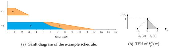 Let u, v, and w be the only three operations in a schedule where u, the job predecessor of w, is processed on its own in a resource, while v is the resource predecessor of w in a second resource. Let the processing times of these tasks be , , and . Clearly, if u and v start at instant 0, their completion times are, respectively, and . Hence, the completion time of u cannot affect the starting time of w, , which, for any feasible schedule, must be such that , with an equality for semi-active schedules, i.e., . The Gantt chart of the schedule, adapted to TFNs, as proposed in [50], can be seen in Figure 1. Now, if we compute the difference, . This number is counterintuitive for two reasons. First, allowing for negative idle time values does not make any sense. This is solved by taking the maximum with, ; so, according to (16), the idle time for w is . We depict the resulting TFN in Figure 1b, where the dashed line represents the negative side that is removed, with the area under the membership function for shaded in grey. The second reason is that common sense dictates that the idle time between two contiguous operations should be zero, as the absence of a gap between v and w in Figure 1 illustrates, but even after eliminating negative values, considers as possible idle times as large as 3. The source of these issues is the wrong underlying assumption that and are independent; so, for instance, could be 5 when is 8 (even if we know this is impossible in a feasible schedule). That is, the independence assumption introduces artificial uncertainty in the resulting difference.