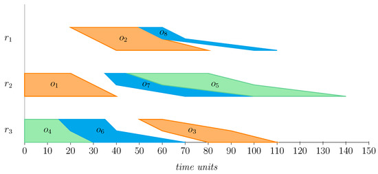 Let us illustrate the three different ways in which can be computed with a toy example. Suppose that we have the schedule depicted in Figure 2, comprising eight operations scheduled in three resources. To represent the different values of the operations in the schedule, we will use grids as the following: