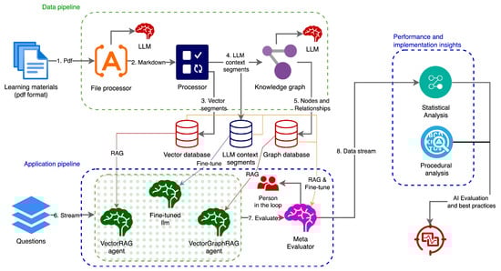 Three distinct agents leverage these prepared resources. The VectorRAG agent utilizes a vector database to retrieve contextually relevant passages before generating or scoring questions [39]. The VectorGraphRAG agent adds a knowledge-graph layer to model interlinked concepts for improved retrieval [40], while the Fine-Tuned LLM agent employs a pre-trained model refined on curated question data [41]. An agent evaluator orchestrates the three core tasks (see Section 3.3), while a Meta Evaluator assigns ground-truth scores and explanation-quality ratings. Human experts oversee the meta-evaluation to safeguard correctness and alignment with course goals.