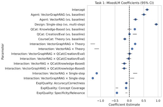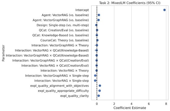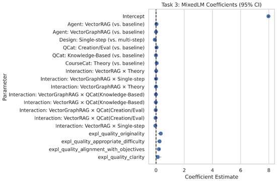 A primary goal was to quantify how accurately each agent (VectorRAG, VectorGraphRAG, and Fine-Tuned LLM v2) performed across the three tasks (alignment evaluation, question improvement, and new question generation) under varying instructional contexts. To achieve this, a linear mixed-effects model (LMM) was fitted for each task. The model accounted for repeated measures on the same question by incorporating random intercepts, thereby mitigating potential correlations. Agent type, course orientation, question design, question category, and explanation-quality subdimensions were entered as fixed effects.