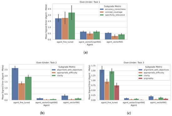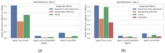 A specialized Meta Evaluator, implemented as GPT4o [48] with strict evaluation policies, assigns ground-truth (reference) scores for each subdimension in Tasks 1–3 by referencing the original course materials. It also reviews each agent’s justifications and produces a rating for explanation quality, emphasizing coherence, factual integrity, and logical clarity. Human experts resolve domain-specific nuances to ensure that all finalized ground-truth scores accurately reflect the intended learning objectives. Task 1 comparisons rely on an absolute error metric between the agent’s subgrades and the meta-evaluator’s ground-truth, whereas Tasks 2 and 3 treat the meta-evaluator’s subgrades as true for measuring how closely the agent’s improved or newly generated question aligns with course standards. The structured dataset ultimately captures all numeric outputs (agent and meta scores) plus explanation-quality ratings, providing a transparent record of agent performance and justifications across a range of question types.