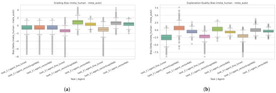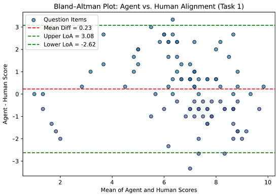 In Task 1, the outcome variable consisted of absolute alignment errors between the agent’s subgrades and the Meta_human reference. For Tasks 2 and 3, the outcome was the Meta_human subgrade assigned to the improved or newly generated questions (e.g., averaged scores for alignment, clarity, difficulty, and originality). By including the same set of fixed effects in these models, the study systematically examined the circumstances under which particular agents excelled or struggled and assessed the impact of explanation clarity on overall performance.