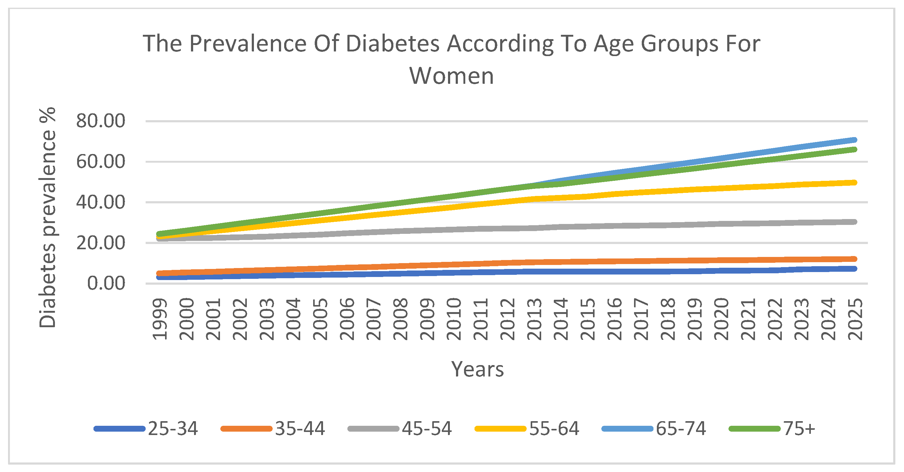 The increasing prevalence of diabetes across all age groups is a concerning trend. As highlighted in the results, the highest rates of diabetes were found among individuals aged 55–74 years, with both men and women showing steady increases in prevalence over time. The findings also highlight gender-based disparities in the prevalence of diabetes, with men generally exhibiting higher rates of the disease but women often experiencing more severe health consequences. This underscores the importance of addressing gender-specific health strategies in diabetes prevention and management.
