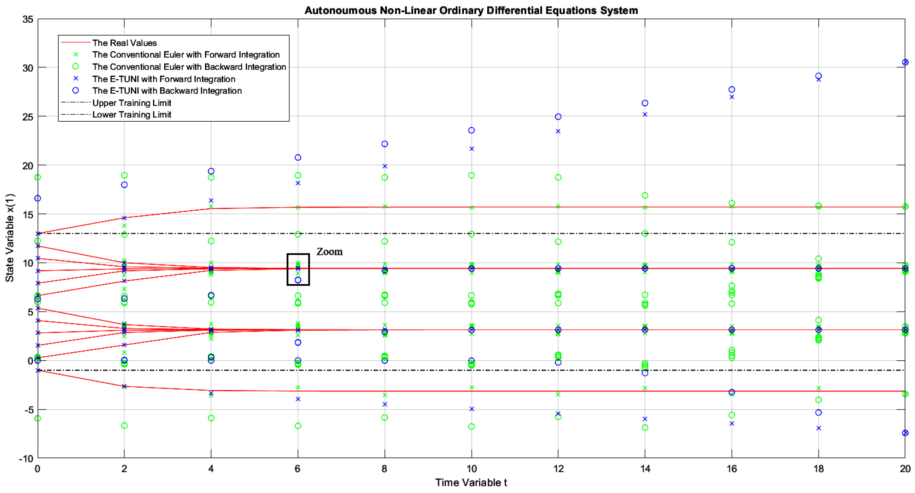 Step 1. Using a high-order 4-5 Runge–Kutta integrator, over the considered autonomous non-linear ordinary differential equation system, randomly generate p training patterns input/output for E-TUNI concerning the initial instant . Perform both forward and backward integration.