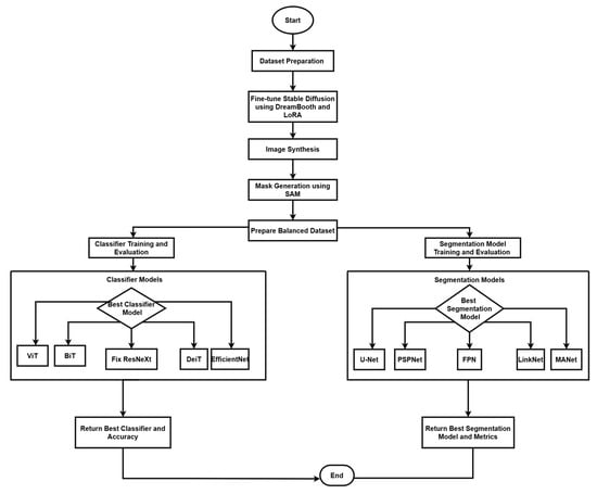 Python 3.10 programming language was used to implement all algorithms. The code was developed and executed using Anaconda 2023.09 distribution for environment management, Google Colab Pro (subscription-based), and Vertex Workbench 1.11 cloud platforms. We utilized various libraries including accelerate 0.16.0, PyTorch 2.0.1, torch-vision 0.15.2, transformers 4.25.1, huggingface hub 0.15.1, diffusers 0.14.0, xformers 0.0.20, and bitsandbytes 0.37.0. Computations were performed on high-performance hardware: g2-standard-48 machines (4 NVIDIA L4 GPUs, 48 vCPUs, 192 GB RAM) and a 40 GB NVIDIA A100 GPU. The system utilized 83.5 GB of total RAM (with 2.2 GB utilized during the experiments) and 40.0 GB of GPU RAM, with a storage capacity of 235.7 GB (100 GB data disk + 150 GB boot disk). With pretrained Stable Diffusion 1.5 and SAM models for image synthesis and segmentation, this configuration facilitated a complete colonoscopy analysis pipeline that was evaluated using a variety of classifier architectures (ViT, BiT, FixResNeXt, DeiT, EfficientNet) and segmentation models (U-Net, PSPNet, FPN, LinkNet, MANet).