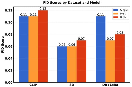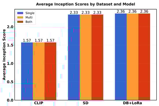 Table 1 presents a comparison of performance metrics (FID scores and average inception scores) in three different models (CLIP, SD and DB + LoRa) in three different datasets (single, multi and both). The FID scores range from 0.06 to 0.12, with SD showing the best performance (lowest FID scores) in all datasets. For Inception scores (IS avg), DB + LoRa consistently achieves the highest values (2.36), followed by SD (2.33), while CLIP shows the lowest IS avg (1.57). Each model maintains consistent performance across different datasets, with only minor variations in FID scores.