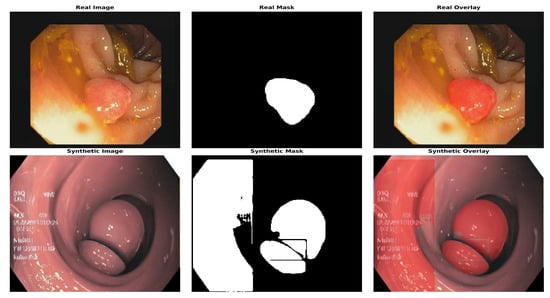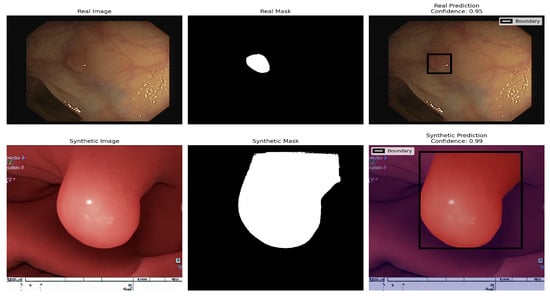 Figure 9 shows the location of the polyp in both real and AI-generated endoscopic views, highlighting the similarity between actual and synthetic medical imaging data. Following mask generation with the Segment Anything Model (SAM), we performed manual visual screening of all masks generated. This validation process involved systematic examination of each image–mask pair to verify accuracy and alignment with anatomical boundaries. Masks that exhibited inaccuracies or did not properly delineate the target structures were excluded from further analysis, ensuring that the dataset contained only precisely segmented regions for subsequent processing. For model training and evaluation, a standard 80:20 train–test split was applied. This approach ensures robust model development by allocating 80% of the data for training and reserving 20% for independent testing, allowing for a comprehensive assessment of the performance and generalizability of the segmentation models.