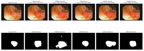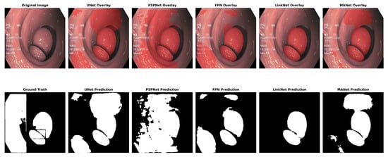 The analyses of the five segmentation models showed that the metrics had varying effects on each model’s performance. With the highest IoU (0.65), UNet showed strong performance in many metrics, particularly achieving the highest recall (0.85) and Dice coefficient (0.78). FPN demonstrated solid results with the highest precision (0.77) and PSNR (7.21). LinkNet achieved the highest F1 score (0.78) among all models, although its other metrics were comparable to its peers. PSPNet showed slightly lower overall performance, with the lowest IoU (0.63) and PSNR (6.64). MANet’s performance was middle of the pack across most metrics, with values generally similar to FPN and LinkNet. Regarding structural similarity, all models showed relatively low SSIM scores ranging from 0.44 to 0.49, with UNet and FPN tied for the highest at 0.49. The PSNR values were consistently in the range of 6–7 in all models, with the FPN achieving the highest at 7.21.