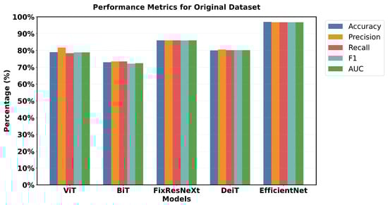EfficientNet has a pronounced superiority in all performance criteria used. Each metric confirmed that EfficientNet has one of the highest validation accuracy values of 97% and an F1 measures of 96.79% and is superior to all the models used. FixResNeXt was slightly less successful with a maximum validation accuracy of 86% and an F1 score of 85.95%. ViT’s results are the second best of all networks, although they are far less impressive than EfficientNet’s 96.79% AUC ratings.