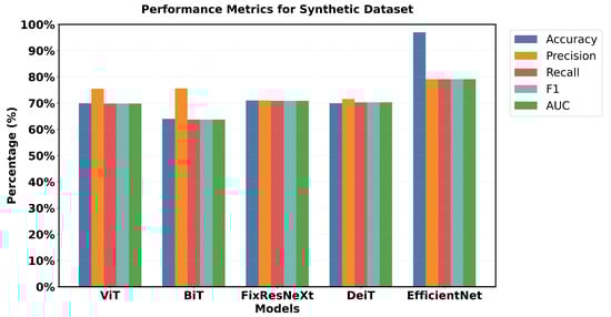 In the case of the synthetic dataset, overall model performances were comparatively lower than those achieved on the original dataset. EfficientNet retains a sample advantage over FixRexNet, although the score boundaries are significantly lower (79% validation accuracy). The performance difference decreases with FixResNeXt and VIT as close competitors, but there are differences in the validation precision: 71% for FixResNeXt and 75.47% for VIT, as seen in