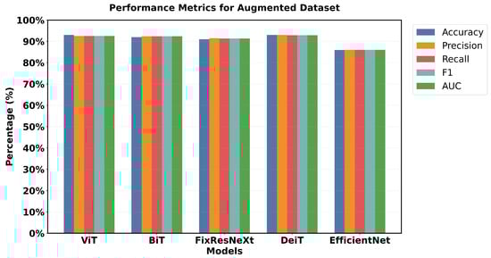 The augmented dataset shows a complete transition. The result shows that ViT and DeiT are the most accurate models with a validation accuracy of 93% and having the highest f1 score of 92.89%.