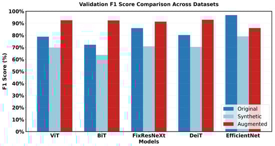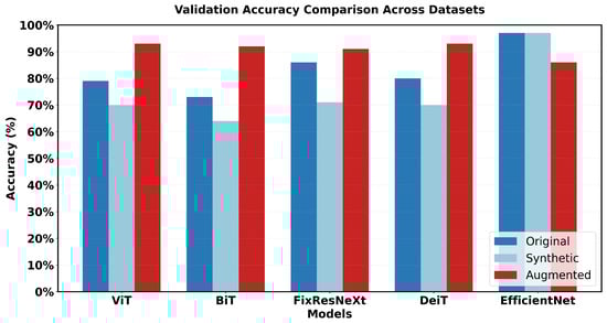 Unlike the original and synthetic datasets, which showed significant performance variations between different architectures, the augmented dataset demonstrated more balanced performance. This indicates reduced architecture-specific bias in the learning process.