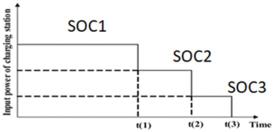 where is the initial SOC of the vehicle i, is the battery capacity of EV i, and is the power rate with which EV is charged. We are considering three levels of SOC for batteries, as depicted in Table 1, and the parking lot’s input–output power will exhibit three stages, similar to the illustration in Figure 1 [].