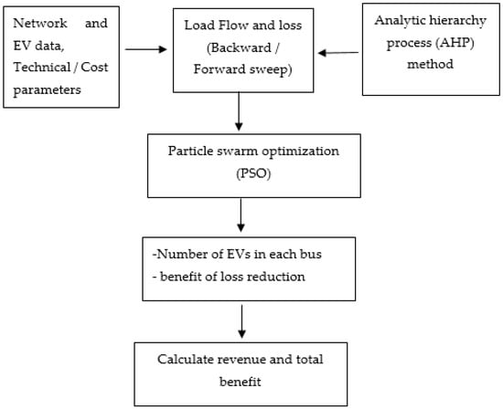 Figure 2 presents the various steps of the proposed solution approach. In the first step, data are collected for the network, EVs, technical parameters, and cost. The AHP (analytic hierarchy process) method is then used to determine the weight of the costs and the revenue criteria. Following this, the backward/forward sweep power flow method is used to calculate power losses in the distribution network. The particle swarm optimization (PSO) algorithm is then employed to determine the number of electric vehicles in each bus and reduce the losses. Finally, the revenue is calculated, which is net income minus the required cost, and at the end, the total benefit is computed. The model was built using Python.