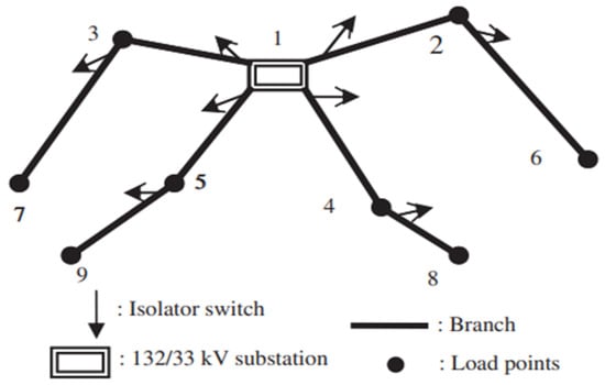 Load flow studies [] are essential for ensuring stable, reliable, and economical transmission of electrical power from generators to consumers through the grid system. We refer to the movement of both reactive and active power as “flow” or “load flow”. A mathematical technique for determining distinct bus voltages, their phase angles, and the flow of reactive and active power across various branches, generators, and loads in a steady-state setting is provided by power flow studies. The backward/forward sweep method is used to evaluate load flow in radial distribution. First, voltage data on the main line and its derivatives are all adjusted to the nominal voltage. Next comes an iterative procedure where Kirchhoff’s Current Law (KCL) is used to compute the branch current in the main line in a backward sweep after currents in derivative lines have been determined. Then, node voltages are calculated using Kirchhoff’s Voltage Law (KVL) in a forward sweep. Until the voltage magnitudes at each node in the current iteration and the previous iterations are lower than the tolerance limit, this backward and forward sweep approach is repeated.