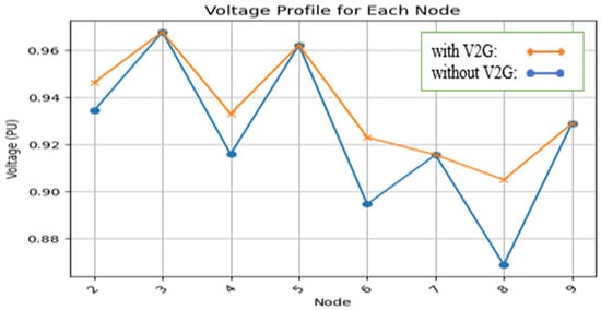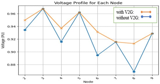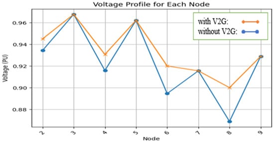 Additionally, in order to see the voltage enhancement in the presence of V2G, the voltage profile is examined for three different scenarios, both with and without V2G power.