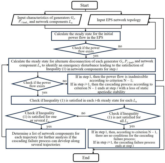 Based on the experience of analyzing steady-state calculations, an algorithm was designed to identify the trajectories of the cascading failure process development for the N–X criterion. For a cascading failure process to develop, the EPS at hand must have the following characteristics: