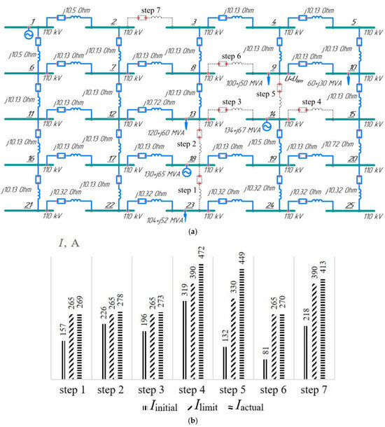 - In each i-th step of the algorithm, if, during the implementation of points 2.4 and 2.5, the calculations indicate that power flow is inadmissible in terms of the static aperiodic stability, then, following the N–1 criterion, the cascading failure process for the given power flow and network topology exists up to the i-th step. Starting with the i-th step, however, the power flow does not exist according to the conditions of static aperiodic stability. Therefore, there is no need to further check for the possibility of cascading failure process development in step i + 1. This is because along this trajectory, the cascading failure process ends with a loss of stability, and hence, it is inadmissible.