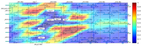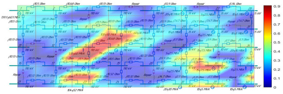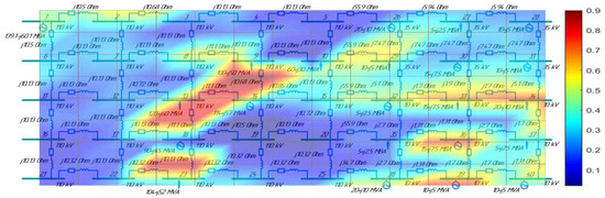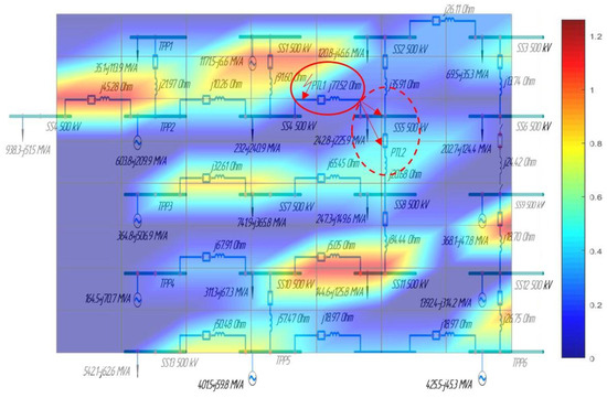 Analysis of EPSs with non-homogeneous parameters should factor in the following: Xij is the inductive resistance of components; Pijgen is generated active power; Pijload is consumed active power at the load nodes. When constructing a 3D graphic surface of influencing factors, it is essential to determine the value of their maximum distribution, Aijmax. The relative values of the influencing factors are determined by Equation (2):