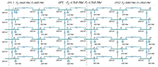 The steady states of EPSs in this study were calculated in RastrWin 3 software (version 2.9.0.640). The stable states of EPSs are those states in which all the parameters of the mode are in the range of acceptable values, which allows for the reliable operation of power plants, as well as uninterrupted power supply to consumers in a given volume and with given indicators of power quality.