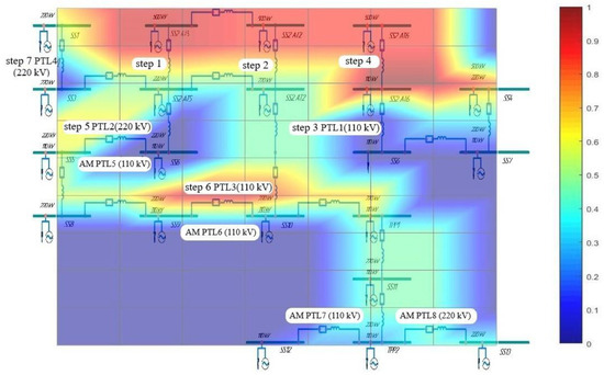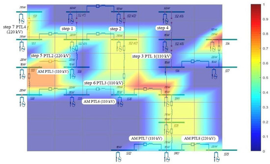 - If in the i-th step of the algorithm, during the implementation of points 2.4 and 2.5, the power flow is admissible in terms of the static aperiodic stability, then, according to the N–1 criterion, the cascading failure process for the given power flow and topology exist before the i-th step. If, at the same time, in step i, no network components Ln for which Inequality (1) is satisfied are identified, then it is not necessary to check for the possibility of cascading failure process development according to the N–1 criterion for the given power flow and network topology along this trajectory in step i +1. This is because the cascading failure process ends with an admissible post-contingency power flow.