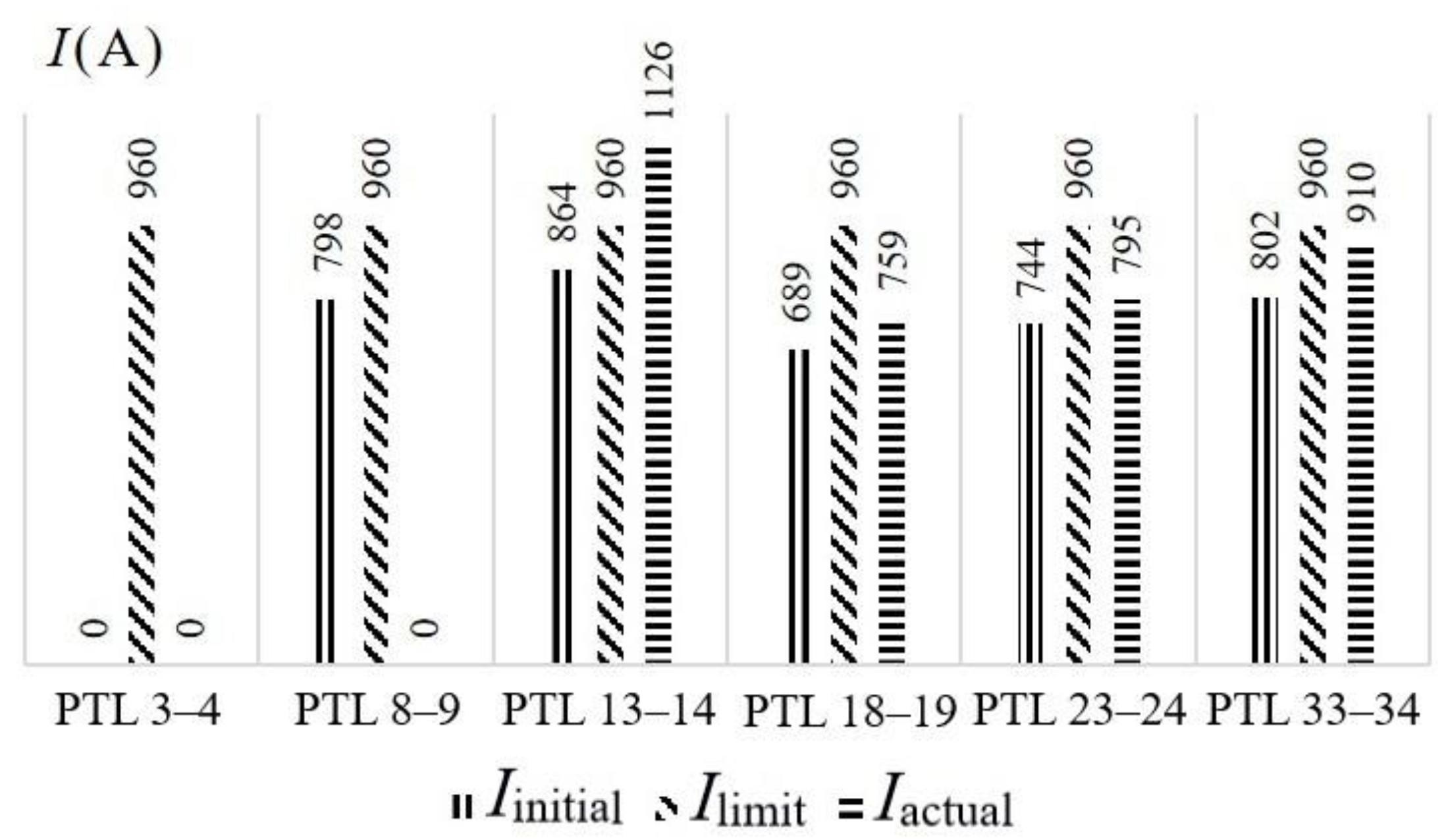 where Iij is the current value in the initial state, A; ΔIij is the value of current surge in an analyzed component under the heavy-load conditions, A; and Iprm.ij is the admissible current value during an emergency for the component A.