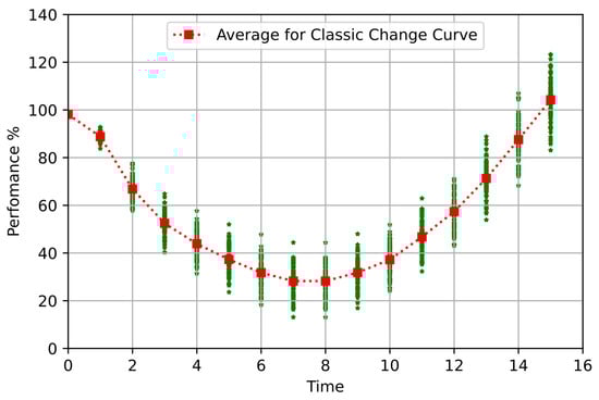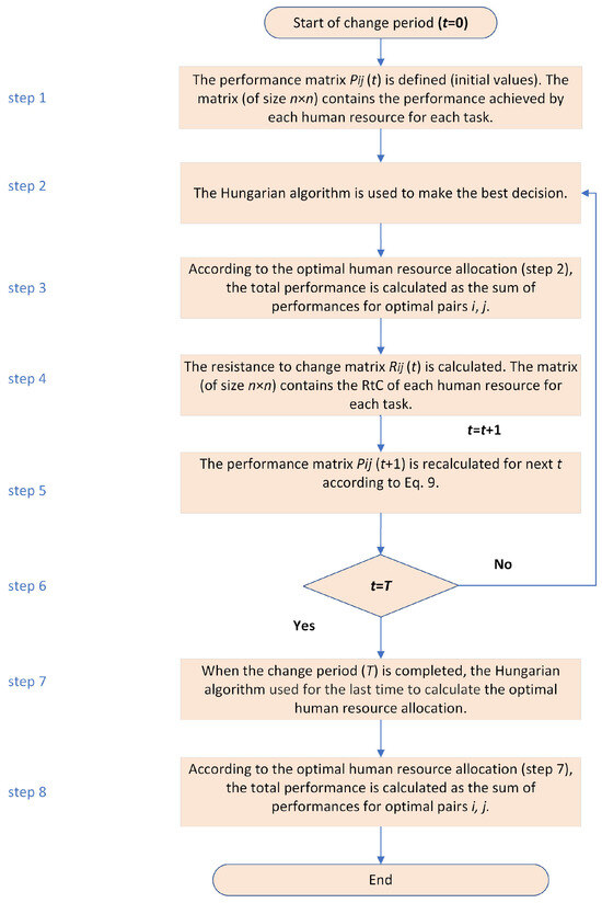 Initially, when the change begins, the first allocation will apply Equation (5) and achieve maximum performance by allocating each employee to a specific task. After this point, RtC will emerge and begin to affect the performance of the workers. The innovative idea of the proposed method is that it considers changes in performance at regular intervals and optimally reassigns human resources. Thus, the RtC of each employee is considered during the change, and the overall performance is improved with this reallocation. Performance is considered time-dependent and can be described by Equation (9) [51]: