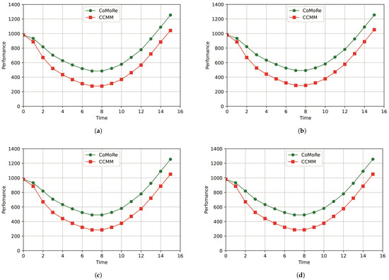 Table 6 shows that in all experiments (100, 1.000, 10.000, and 100.000 repetitions), the average total performance starts ( t = 0 ) at a value of 981 in both methods. From t = 1 to t = 7, the overall performance for the proposed CoMoRe method begins to be significantly better than that for the CCMM method. At t = 7, the lowest total performance has a value of 491 for CoMoRe versus 286 for the CCMM. This is the most critical point in the change process. At the next time step, the performance starts to increase. At t = 14 for 100.000 iterations, the total performance for the proposed CoMoRe method is 1091 and has exceeded the initial total performance (981), while the total performance for the CCMM is less than the initial total performance, with a value of 886. Thus, the new desired state that improves performance over the initial state is reached in a shorter time.