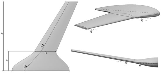 The design space accommodates both conventional and BWB UAVs. Conventional UAV wings are typically defined with one or two sections (i.e., the distinct trapezoidal planform surfaces that constitute the wing, are referred to as wing sections), as seen in Figure 1, and are differentiated from the rest of the aircraft. In contrast, BWB UAVs have a more integrated structure, where the “fuselage-body” and wings blend into a continuous aerodynamic shape, as seen in Figure 1.