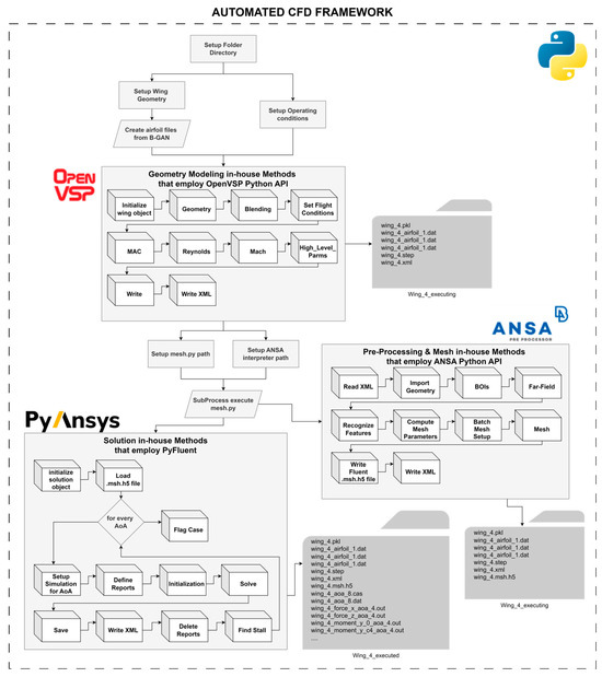 Several studies have explored the potential for fully automating the time-intensive phase of aerodynamic evaluation [14,15,16]. These works highlight specific algorithmic strategies to accelerate aspects of the design process, such as focusing on the solution phase alone, automating calculations (e.g., decomposing forces into lift and drag), or employing high-performance computing. Other research efforts have adopted a more holistic approach to address the problem comprehensively.