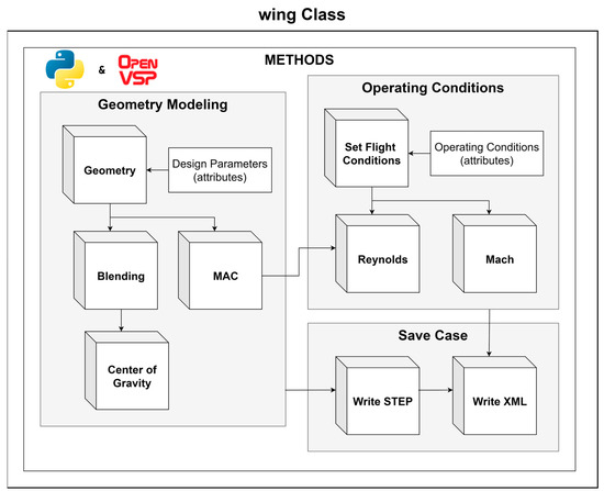 The geometry module is critical for generating CFD-ready wing geometries, ensuring compatibility with the following meshing and simulation processes. According to [41], a “good” geometric model tailored to the requirements of CFD not only enhances workflow efficiency but also ensures reliable and reproducible results—an essential objective of this framework, where robustness is paramount. Using an object-oriented programming approach, the module features a dedicated Wing class, as shown in Figure 5.