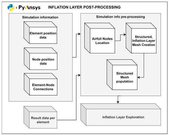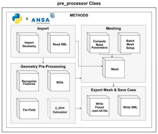 Implemented via the ANSA Python API, the module uses an object-oriented pre_processor class with four method categories, as illustrated in Figure 6. The process begins with import methods, which handle the data transfer from the geometry module, importing STEP files and extracting attributes from the XML file for a case-specific setup. Next, feature recognition is performed to identify critical regions such as leading edges, trailing edges, and sharp perimeters. Bodies of Influence (BOIs) are then defined, along with the far-field boundaries of the computational domain. Following these geometric pre-processing steps, the meshing operations take place. Mesh parameters are dynamically adjusted using the custom Compute_Mesh_Parameters method and the geometric attributes of the given wing. The custom Batch_Mesh_Setup method then updates the meshing sessions/scenarios before generating the mesh in the following sequence: (1) surface meshing for both the wing wall and the far-field boundaries, (2) inflation layer mesh, and finally (3) volume meshing. Finally, the Export Mesh and Save Case methods save the mesh in Fluent-compatible .msh.h5 format and generate XML files for case tracking and attribute documentation.