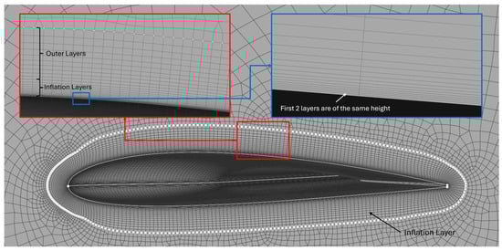The inflation layer height is calculated iteratively, starting with an initial thickness of twice the first layer height. Successive layers are generated using a growth factor, typically set to for smooth transitions. The iterative process continues until the total inflation thickness equals or exceeds the estimated boundary layer thickness (). When the total inflation thickness exceeds the flat plate boundary layer height, the number of layers is returned and adjusted by a safety factor () to ensure adequate coverage, according to suggested practices [41]. Finally, additional layers are placed on top for redundancy. The following inflation layer (Figure 7) is produced automatically using the proposed framework.