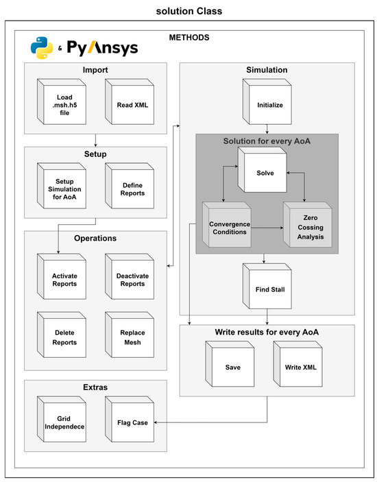 The solver module integrates ANSYS Fluent 2023R2 via PyFluent to automate simulation setup, execution, and post-processing. Utilizing Fluent’s GPU-native solver, calculations achieve up to 7× faster computational times compared to parallel CPU solvers, significantly reducing simulation duration [47]. A dedicated solution class, illustrated in Figure 8, manages input and output files, simulation setup, and execution. It also supports stall detection and convergence monitoring methods, ensuring high-fidelity results with minimal manual effort.