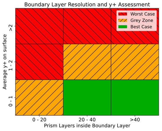 Another important aspect for the inflation layer is that its total height was designed to be larger than the total height of the boundary layer. This choice is guided by a well-established rationale [44,48], ensuring a sufficient number of cells within this critical region for accurate simulation. The total boundary layer height () can be approximated using Equation (A3) according to [37]. This relationship applies only for a fully turbulent flow over a flat plate. However, it can serve as a reliable indication, given that a turbulent boundary layer is thicker than its laminar counterpart (e.g., provided that the pressure gradients are identical).