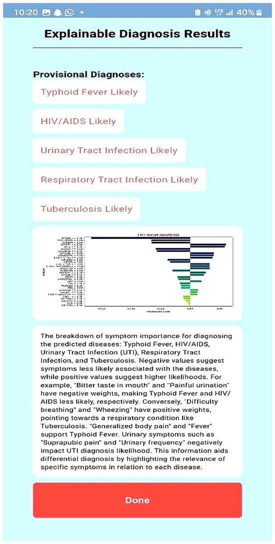 - Explainability Layer: To enhance interpretability, LIME-0.2.0.1 is applied to highlight the most important symptoms influencing the diagnosis. Additionally, ChatGPT processes the model’s outputs to generate human-readable explanations;