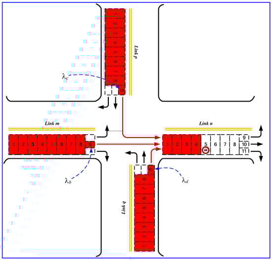 In previous studies [10,14,27,28], a specific cell (λ = 9) was divided into three sub-cells (λb, λc, and λd) to accommodate vehicles going straight, turning left, and turning right, respectively. A pseudocode illustrating the vehicle allocation rule of the traditional CTM method is shown in Algorithm 1.