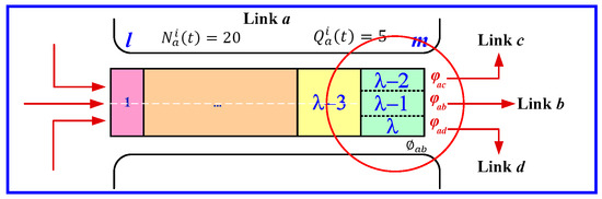 Considering the limitations of traditional CTMs, we modify the three sub-cells λb, λc, and λd into independent cells λ − 2, λ − 1, and λ, respectively. Figure 3 illustrates the modified downstream queues of link a. Moreover, the maximum number of vehicles that can occupy cell i of link a is specified as .