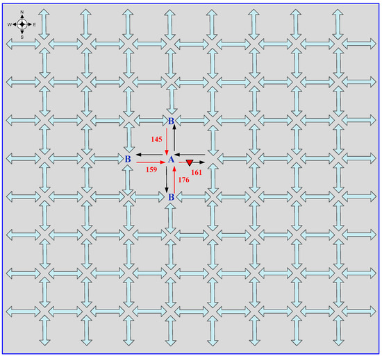 Based on the definition provided above, we developed a time-step-based traffic simulation environment using MATLAB to model traffic jam propagation and dispersion. This simulation is built on the CTM, allowing for a detailed representation of realistic traffic dynamics. In Figure 5, we illustrate a two-way 8 × 8 grid traffic network to demonstrate how traffic congestion spreads after an accident. In this 8 × 8 grid network model, each pair of adjacent vertices (intersections) is connected by two unidirectional links (one for each direction of traffic flow). This bidirectional design ensures a realistic representation of urban grid networks, where vehicles move independently in opposing directions.