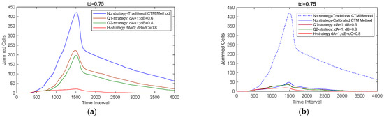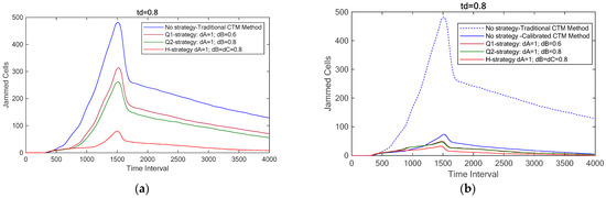 This example illustrates the differences between traditional vehicle allocation rules 6 and our new allocation rules 6. We analyze traffic jam formation and dispersion using three strategies, i.e., no strategy, Q-strategy, and H-strategy, under both the traditional and calibrated CTM methods. In this case, an accident occurs between the 301st and 1500th time intervals. Here, dA = 1.0 with dB = 0.6 and dC = 0.8 are for the Q-strategy, and dA = 1 and dB = dC = 0.8 are for the H-strategy. Figure 6a shows traffic jam propagation and dispersion using the traditional CTM method with td = 0.75, based on parameters from Luo et al. [17]. For comparison, Figure 6b presents the simulation results for both the traditional and calibrated CTM methods, also with td = 0.75.