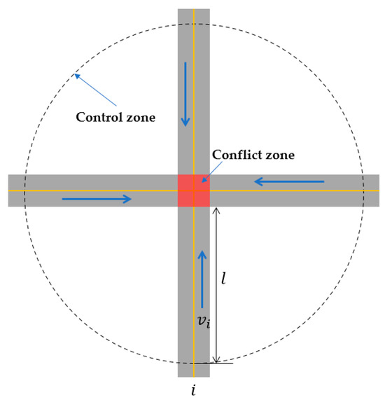 As major bottlenecks in cities, intersections are often prone to traffic congestion and accidents [1,2,3]. Traffic signal control is commonly employed at intersections to spatially and temporally separate vehicles, thereby preventing vehicle conflicts. In recent years, the development of vehicle–infrastructure cooperated autonomous driving has facilitated the implementation of connected automated vehicles (CAVs) [4,5,6,7]. Existing research [8,9,10,11] indicates that the application of CAVs can enhance traffic efficiency and significantly improve traffic safety. Therefore, studying intersection control in the connected automated environment is beneficial for improving the traffic flow efficiency at intersections [12,13,14,15].