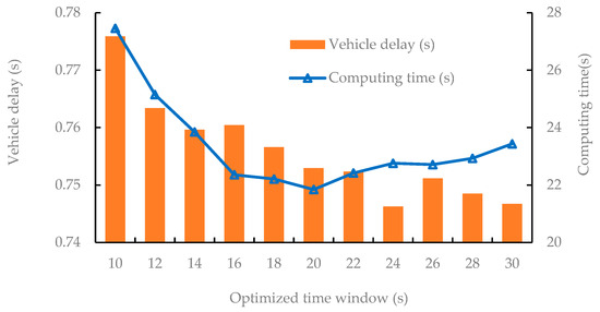 To investigate the impact of the optimized time window length on the model solution results, the optimized time window length is set to values ranging from 10 to 30 s [2,6,13,14], with a step size of 2 s, and an optimization time duration of 900 s, while keeping the other parameters unchanged, as detailed in Table 2. Through calculations, the average vehicle delay and total computation time under different optimized time window lengths are obtained, as shown in Figure 2.
