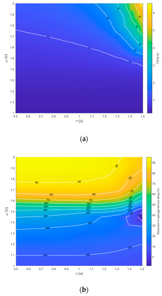 To analyze the impact of safe headway distance on the model solution results, the same-direction safe headway time is set to values ranging from 0.5 to 1.5 s, and the conflicting-direction safe headway time is set to values ranging from 1 to 2 s [2,6,13,14], while keeping other parameters unchanged, as detailed in Table 2. Through calculations, the average vehicle delay and the reduction in average vehicle delay under different safe headway conditions are obtained, as shown in Figure 3.