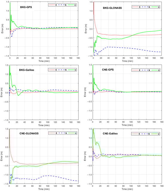 For the GPS PPP model, it is obvious that the obtained positioning accuracy through the five products is within the decimeter level with superiority of BKG, CNE, and WHU products; furthermore, CNE and WHU products accelerate the convergence time compared with the other products, and there are some clear gaps in the obtained solutions from the IGS products. This is due to interruption in the real-time data streams. It is also found that the GLONASS PPP solution’s accuracy is within the sub-meter level in the north and height components, but not in the east component. This is attributed to the GLONASS orbit and clock products’ accuracy attainable from the five centers and the GLONASS satellite configuration; on the other hand, by using the five products, real-time Galileo PPP solutions achieve decimeter position accuracy in three directions. Moreover, acceleration in the Galileo PPP’s convergence time is achieved in the three components. An exception is the height component obtained from GFZ and WHU products.