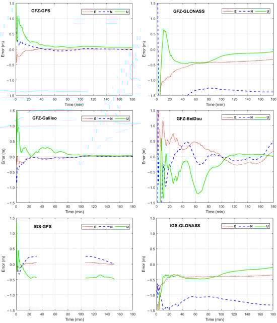 The positioning errors of the four real-time precise point positioning solutions are computed in the east, north, and height directions. The proposed PPP models are compared with the station’s coordinates computed from the geodetic-grade post-processed GPS PPP model. Figure 5 illustrates the three-hour positioning errors of GPS, GLONASS, Galileo, and BeiDou PPP solutions, respectively, on DOY 225 as an example. As previously mentioned in Table 1, only GFZ, IGS, and WHU analysis centers offer BeiDou orbit and clock corrections.