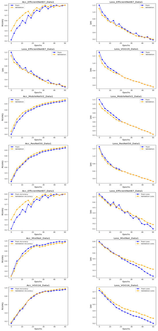 As mentioned in Section 3 two datasets are used for these experiments. These datasets were carefully divided into a training dataset and a test dataset, with a proportion of 80% for training and 20% for testing. The data were rigorously pre-processed. This crucial step enabled to ensure the consistency and quality of the data before using them to train our models. The proposed CNN models were trained over 50 epochs using transfer learning an example of the implementation of this process with the VGG16 model.